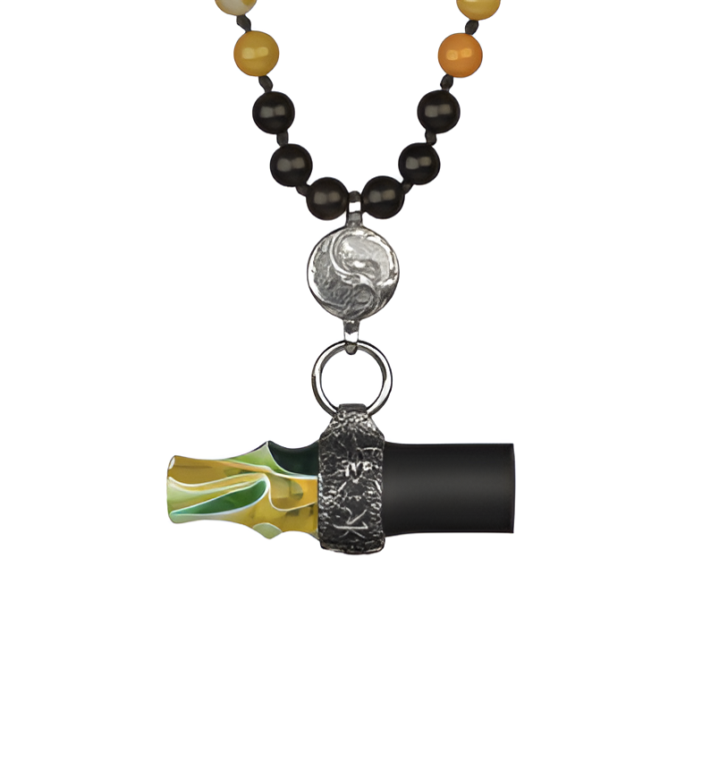 The base of the mouthpiece is made of stainless steel. The beads are made of natural wood and natural stone.